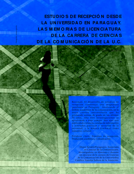 "El desarrollo de estudios de recepción constituye una asignatura pendiente en Paraguay. Analizando el ámbito académico de la comunicación, en la única carrera universitaria que ha producido tesinas de grado en los últimos 30 años, sólo tres investigaciones se aproximan a este campo. Sus ejes son publicidad e infancia, canales de información y actitudes políticas y sexuales de la juventud, y la música (cachaca) como industria cultural." (Resumen)