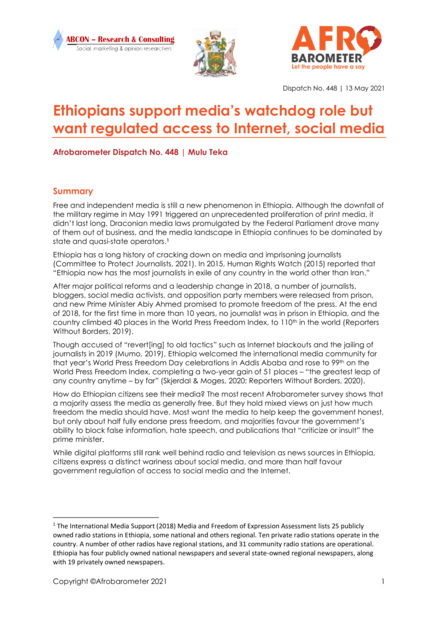 "Six in 10 adult Ethiopians (59%) own a mobile phone. But only 16% own a phone with Internet access. One in three (34%) own a radio, while 14% have a television set and only 2 % have a computer. The most common source of regular news (“every day” or “a few times a week”) for Ethiopians is the radio (50%), followed by TV (24%), social media (12%), the Internet (9%), and newspapers (2%). A majority (59%) of Ethiopians assess the media as “somewhat free” or “completely free.” Only one in four (26%) consider the media “not very” or “not at all” free. But Ethiopians hold mixed views on just how free the media should be. While more than three-fourths (77%) want the media to report on government mistakes and corruption, almost half (48%) say the government should have the right to prevent the publication of things it disapproves of. And large majorities endorse the government’s right to prohibit the sharing of false information (79%) and hate speech (73%). Majorities say social media users (55%), politicians (52%), and activists (51%) “sometimes” or “often” knowingly spread false information or “fake news.” Only three in 10 Ethiopians (30%) have heard about social media. Among these citizens, more than half (54%) say social media has “somewhat positive” or “very positive” effects on society, while 35% see its effects as mostly negative." (Key findings, page 2)