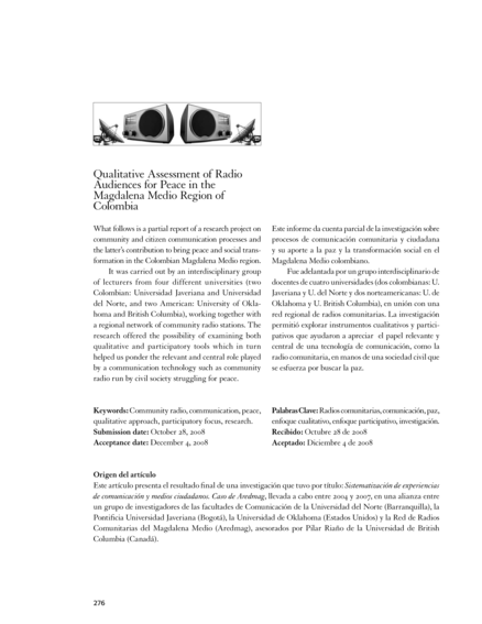 "Este informe da cuenta parcial de la investigación sobre procesos de comunicación comunitaria y ciudadana y su aporte a la paz y la transformación social en el Magdalena Medio colombiano. Fue adelantada por un grupo interdisciplinario de docentes de cuatro universidades (dos colombianas: U. Javeriana y U. del Norte y dos norteamericanas: U. de Oklahoma y U. British Columbia), en unión con una red regional de radios comunitarias. La investigación permitió explorar instrumentos cualitativos y participativos que ayudaron a apreciar el papel relevante y central de una tecnología de comunicación, como la radio comunitaria, en manos de una sociedad civil que se esfuerza por buscar la paz." (Resumen)
