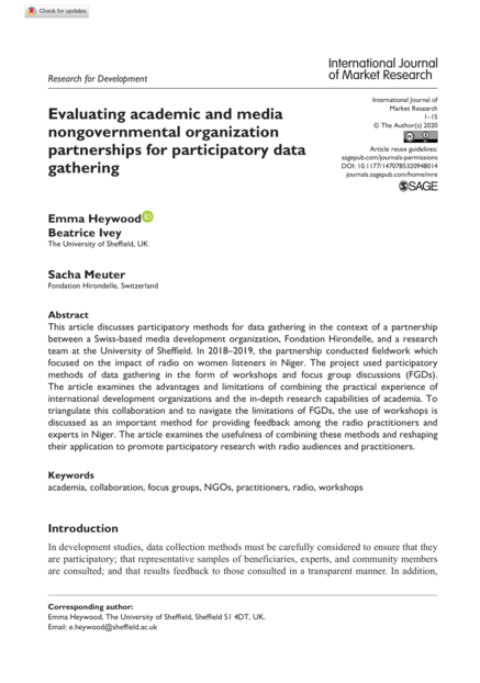"This article discusses participatory methods for data gathering in the context of a partnership between a Swiss-based media development organization, Fondation Hirondelle, and a research team at the University of Sheffield. In 2018–2019, the partnership conducted fieldwork which focused on the impact of radio on women listeners in Niger. The project used participatory methods of data gathering in the form of workshops and focus group discussions (FGDs). The article examines the advantages and limitations of combining the practical experience of international development organizations and the in-depth research capabilities of academia. To triangulate this collaboration and to navigate the limitations of FGDs, the use of workshops is discussed as an important method for providing feedback among the radio practitioners and experts in Niger. The article examines the usefulness of combining these methods and reshaping their application to promote participatory research with radio audiences and practitioners." (Abstract)