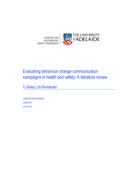 "This literature review examined selected international research, published from 2010 to the present, to investigate how six fields other than road safety (i.e. healthy eating/physical activity, smoking, alcohol and drug use, workplace health and safety, suicide and juvenile offending) evaluated their behaviour change communication campaigns. The review also considered best practice for providing evidence of the effectiveness of these campaigns and explored whether these practices could be translated to road safety. Overall, the health and safety literature indicate that there is no single model for best practice in evaluating communication campaigns but there are some general principles that are highly germane to road safety: using a recognised model/theory of behaviour change, multiple measurement methods, measuring target behaviours at each stage, using a control group not exposed to the campaign, and identifying factors that can influence the likelihood of the desired behaviour. While some direct and indirect objective measures of behaviour change were available, by far the most common measure was selfreport surveys. This set of evaluation tools, and their limitations, are consistent with the road safety experience. In conclusion, given adequate resources, all health and safety domains, including road safety, might improve the quality of their evaluations with sound experimental designs and the increased use of objective forms of behaviour measurement, aided by advances in affordable technology." (Abstract)
