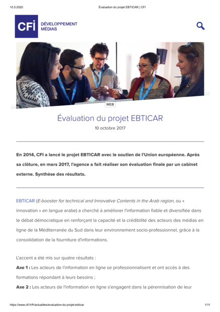 "EBTICAR (E-booster for technical and Innovative Contents in the Arab region, ou « innovation » en langue arabe) a cherché à améliorer l'information fiable et diversifiée dans le débat démocratique en renforçant la capacité et la crédibilité des acteurs des médias en ligne de la Méditerranée du Sud dans leur environnement socio-professionnel, grâce à la consolidation de la fourniture d'informations [...] "Un projet efficace mais dont l'impact demeure fragile: Sur la base des constats de l'évaluation, les objectifs d' de l'UE restent ambitieux et l'objectif macro du programme semble être déconnecté des modalités du projet micro et de sa durée de 36 mois. Au-delà du soutien technique, financier et administratif des projets sélectionnés dans le cadre des appels à proposition, des mesures d'accompagnement allant au-delà des projets mériteraient d'être mises en place pour répondre aux besoins structurels des acteurs au-delà de la portée du programme." (Sommaire)