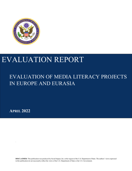 "The United States (U.S.) Department of State Bureau of Europe and Eurasia/Office of the Coordinator of Assistance to Europe, Eurasia, and Central Asia (EUR/ACE) contracted Social Impact, Inc. (SI) to conduct a performance evaluation of nine media literacy (ML) assistance projects in Europe and Eurasia. These projects were selected by ACE and its partners to represent a wide range of USG target groups and assistance modalities. Six of the projects were funded by ACE and three were funded by the Global Engagement Center (GEC). In addition to GEC, the projects were implemented by the following ACE partners: the Department of State’s Bureau of Democracy, Human Rights, and Labor (DRL); the National Endowment for Democracy (NED), and the U.S. Agency for International Development (USAID). The evaluation assesses project performance during the period 2017-2020. The purpose of this evaluation was to independently assess the strategic approach, relevance, and overall effectiveness of selected projects, identifying lessons to inform future programming in the region. The primary intended users of this evaluation are EUR, ACE, GEC, DRL, NED, USAID’s Bureau for Europe and Eurasia, USAID field missions, and U.S. embassies in the region. The findings and recommendations are also useful to other State Department and USAID bureaus worldwide, and other donors and funders who are active in promoting ML globally." (Executive summary, page vi)