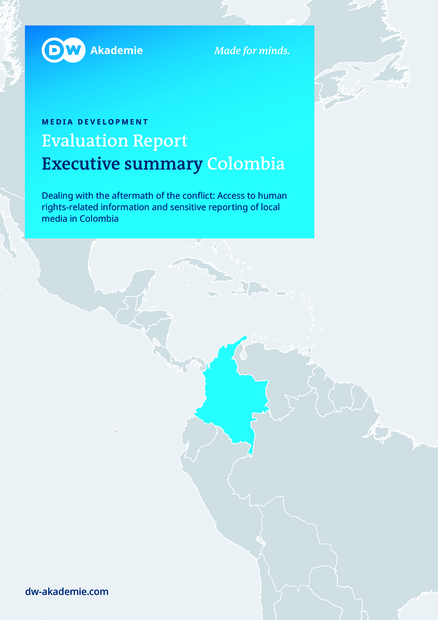 "DW Akademie’s project in Colombia supports initiatives that promote the inclusion of diverse experiences in the country’s historical memory, focusing in particular on the local effects of the peace process. In general, these initiatives are aimed at giving Colombians, mainly victims and people in post-conflict areas, access to human rights-related information. To this end, the project works with different implementing partners and approaches: Consejo de Redacción (CdR) to develop training and journalistic consultancy services in regions affected by armed conflict; the community radio station Vokaribe to strengthen the community media sector on the Atlantic coast; the University of Antioquia (UdeA) in Medellín, to support the establishment of an academic centre for journalism and historical memory, as well as the training of local media and victims of conflict to report on sensitive human rights issues; the Consejo Regional Indígena del Cauca (CRIC) based in the department of Cauca to promote the creation of a media centre aimed at increasing media diversity and, in particular, the participation of indigenous minorities in public discourse; and FLIP, the Foundation for Press Freedom in Bogotá. The project was evaluated along the five OECD/DAC evaluation criteria (relevance, effectiveness, efficiency, impact and sustainability). For each criterion, the DW Akademie scoring system was applied. In addition, according to DW Akademie policy, three digital questions were included. Gender was assessed as a cross-cutting topic." (Background)