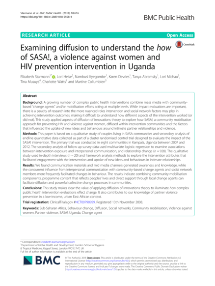 "This paper is based on a qualitative study of couples living in SASA communities and secondary analysis of endline quantitative data collected as part of a cluster randomised control trial designed to evaluate the impact of the SASA! intervention. The primary trial was conducted in eight communities in Kampala, Uganda between 2007 and 2012. The secondary analysis of follow up survey data used multivariate logistic regression to examine associations between intervention exposure and interpersonal communication, and relationship change (n = 928). The qualitative study used in-depth interviews (n = 20) and framework analysis methods to explore the intervention attributes that facilitated engagement with the intervention and uptake of new ideas and behaviours in intimate relationships. We found communication materials and mid media channels generated awareness and knowledge, while the concurrent influence from interpersonal communication with community-based change agents and social network members more frequently facilitated changes in behaviour. The results indicate combining community mobilisation components, programme content that reflects peoples’ lives and direct support through local change agents can facilitate diffusion and powerful collective change processes in communities." (Abstract)