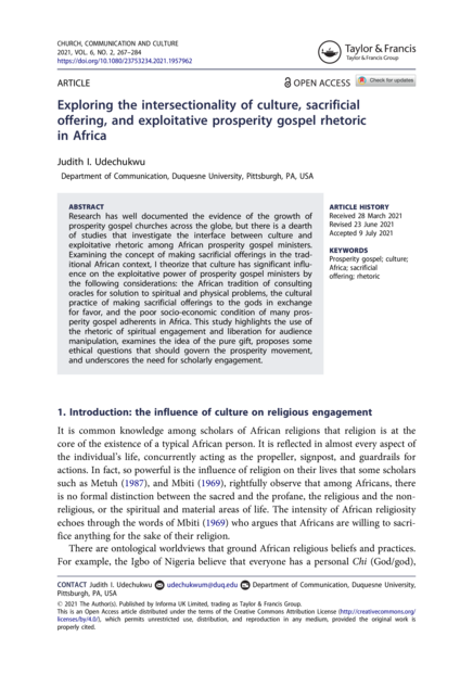 "Research has well documented the evidence of the growth of prosperity gospel churches across the globe, but there is a dearth of studies that investigate the interface between culture and exploitative rhetoric among African prosperity gospel ministers. Examining the concept of making sacrificial offerings in the traditional African context, I theorize that culture has significant influence on the exploitative power of prosperity gospel ministers by the following considerations: the African tradition of consulting oracles for solution to spiritual and physical problems, the cultural practice of making sacrificial offerings to the gods in exchange for favor, and the poor socio-economic condition of many prosperity gospel adherents in Africa. This study highlights the use of the rhetoric of spiritual engagement and liberation for audience manipulation, examines the idea of the pure gift, proposes some ethical questions that should govern the prosperity movement, and underscores the need for scholarly engagement." (Abstract)