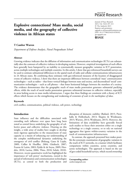 "Growing evidence indicates that the diffusion of information and communication technologies (ICTs) can substantially alter the contours of collective violence in developing nations. However, empirical investigations of such effects have generally been hampered by an inability to systematically measure geographic variation in ICT penetration, across multiple technologies and multiple countries. In this article, I show that geo-referenced household surveys can be used to estimate subnational differences in the spatial reach of radio and cellular communications infrastructures in 24 African states. By combining these estimates with geo-referenced measures of the location of disaggregated events of collective violence, I show that there are important differences between centralized ‘mass’ communication technologies – such as radios – that foster vertical linkages between state and society, and decentralized ‘social’ communication technologies – such as cell phones – that foster horizontal linkages between the members of a society. The evidence demonstrates that the geographic reach of mass media penetration generates substantial pacifying effects, while the reach of social media penetration generates substantial increases in collective violence, especially in areas lacking access to mass media infrastructure. I argue that these findings are consistent with a theory of ICT effects which focuses on the strengthening and weakening of economies of scale in the marketplace of ideas." (Abstract)
