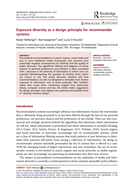 "Personalized recommendations in search engines, social media and also in more traditional media increasingly raise concerns over potentially negative consequences for diversity and the quality of public discourse. The algorithmic filtering and adaption of online content to personal preferences and interests is often associated with a decrease in the diversity of information to which users are exposed. Notwithstanding the question of whether these claims are correct or not, this article discusses whether and how recommendations can also be designed to stimulate more diverse exposure to information and to break potential ‘filter bubbles’ rather than create them. Combining insights from democratic theory, computer science and law, the article makes suggestions for design principles and explores the potential and possible limits of ‘diversity sensitive design’." (Abstract)