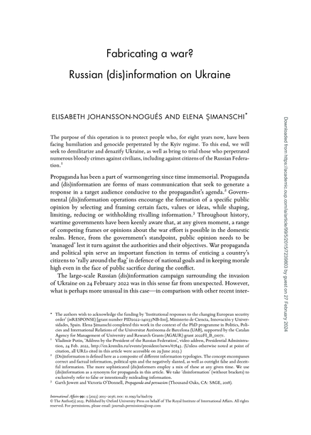 "Propaganda has been an age-old part of warmongering. It is thus no surprise that the Russian invasion of Ukraine was preceded by, and continues to be fuelled by, propaganda transmitted by state-controlled Russian media. What is more unusual about the Russian (dis)information campaigns is the sheer volume of distorted narratives or complete fictional accounts about the conflict. This article explores the content and technologies of Russian information manipulation of domestic audiences in the context of the invasion of Ukraine. We also examine the bases for the sustained robust public support for the war within Russia during the first 12 months of the conflict, despite being based on mostly fabricated (dis)information. Relying on political psychology and communication theory we explain how emotions and associative memories have played an important role in the Russian public's sustained approval to the war. Our findings point to that in the absence of contrasted and independently-verified information, the volume, frequency, emotional intensity of slick, plug-and-play media packages on Ukraine have acted to displace and distort the average Russian's associative social monitoring processes." (Abstract)
