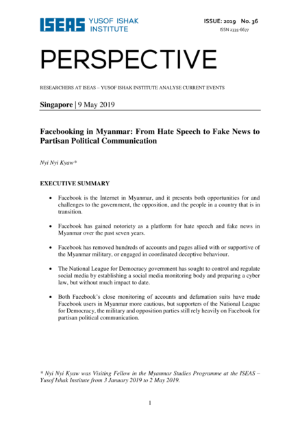 "Facebook is the Internet in Myanmar, and it presents both opportunities for and challenges to the government, the opposition, and the people in a country that is in transition. Facebook has gained notoriety as a platform for hate speech and fake news in Myanmar over the past seven years. Facebook has removed hundreds of accounts and pages allied with or supportive of the Myanmar military, or engaged in coordinated deceptive behaviour. The National League for Democracy government has sought to control and regulate social media by establishing a social media monitoring body and preparing a cyber law, but without much impact to date. Both Facebook’s close monitoring of accounts and defamation suits have made Facebook users in Myanmar more cautious, but supporters of the National League for Democracy, the military and opposition parties still rely heavily on Facebook for partisan political communication." (Executive summary)