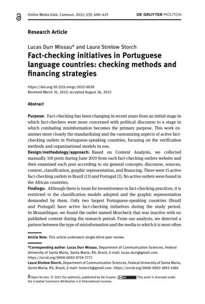 "This work examines more closely the standardizing and the customizing aspects of active factchecking outlets in Portuguese-speaking countries, focusing on the verification methods and organizational models in use. Based on Content Analysis, we collected manually 318 posts during June 2019 from each fact-checking outlets website and then examined each post according to six general concepts: discourse, sources, context, classification, graphic representation, and financing. There were 15 active fact-checking outlets in Brazil (13) and Portugal (2). No active outlets were found in the African countries. Findings: Although there is room for inventiveness in fact-checking practices, it is restricted to the classification models adopted and the graphic representation demanded by them. Only two largest Portuguese-speaking countries (Brazil and Portugal) have active fact-checking initiatives during the study period. In Mozambique, we found the outlet named Mozcheck that was inactive with no published content during the research period. From our analysis, we detected a pattern between the type of misinformation and the media to which it is most often linked: false information was circulated mainly in texts, while false contexts were mainly circulated in videos and images led to more manipulated content." (Abstract)