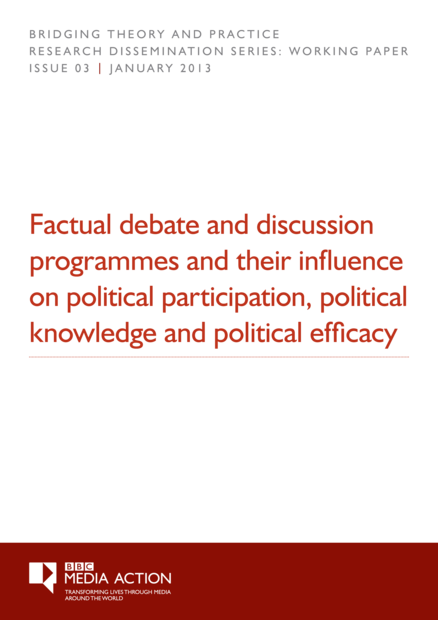 "The review found that there is evidence that exposure to dialogic formats can have an impact on political participation. It is clear, however, that the relationship between exposure to programming and manifest forms of participation cannot be studied in isolation to other important outcomes such as knowledge, efficacy and most especially interpersonal discussion. Studies show that exposure to dialogic formats can increase both the effectiveness and intensity of interpersonal discussion, which in turn is found to be associated with more goal-oriented forms of participation such as intention to vote and participation in public forums. Likewise, knowledge is strongly associated with both manifest and political forms of participation, and so has the potential to play a mediating role in the relationship between exposure and increased participation." (Executive summary)