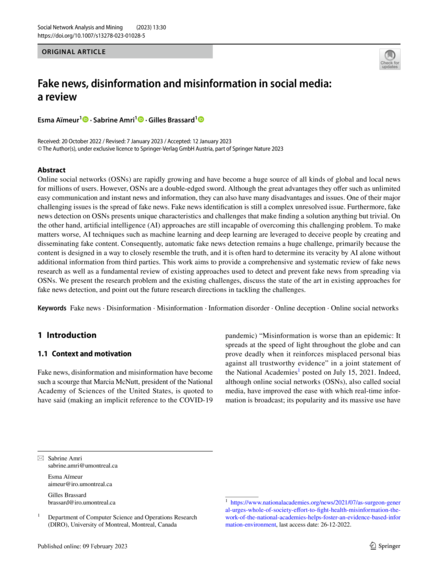 "This work aims to provide a comprehensive and systematic review of fake news research as well as a fundamental review of existing approaches used to detect and prevent fake news from spreading via OSNs. We present the research problem and the existing challenges, discuss the state of the art in existing approaches for fake news detection, and point out the future research directions in tackling the challenges." (Abstract)