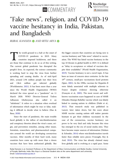 “Fake News”, Religion, and COVID-19 Vaccine Hesitancy in India, Pakistan, and Bangladesh