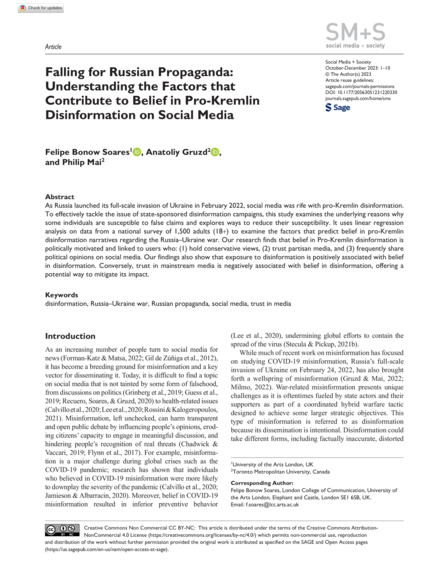 "As Russia launched its full-scale invasion of Ukraine in February 2022, social media was rife with pro-Kremlin disinformation. To effectively tackle the issue of state-sponsored disinformation campaigns, this study examines the underlying reasons why some individuals are susceptible to false claims and explores ways to reduce their susceptibility. It uses linear regression analysis on data from a national survey of 1,500 adults (18+) to examine the factors that predict belief in pro-Kremlin disinformation narratives regarding the Russia–Ukraine war. Our research finds that belief in Pro-Kremlin disinformation is politically motivated and linked to users who: (1) hold conservative views, (2) trust partisan media, and (3) frequently share political opinions on social media. Our findings also show that exposure to disinformation is positively associated with belief in disinformation. Conversely, trust in mainstream media is negatively associated with belief in disinformation, offering a potential way to mitigate its impact." (Abstract)