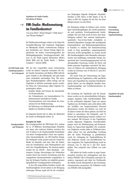 "In einer repräsentativen Face-to-Face-Befragung wurden im Mai/Juni 2011 zunächst grundlegende Kommunikations- und Mediennutzungsstrukturen in Familien mit Kindern zwischen drei und 19 Jahren ermittelt, wobei alle Familienmitglieder einzeln befragt wurden. Ergänzend wurde eine Tagebucherhebung durchgeführt, um allgemeine Tätigkeiten, Freizeitbeschäftigungen sowie die Mediennutzung und Kommunikation im Tagesablauf zu erfassen. Familie bedeutet für die Befragten vor allem Zusammenhalt, Zusammengehörigkeit und Geborgenheit. Familien sind sehr gut mit Medien ausgestattet: Computer, Internet, Fernseher, Radio, Handy und verschiedene Geräte zum Aufzeichnen von Fernsehinhalten gehören zur Standardausstattung fast aller Haushalte. Auch die Kinder der untersuchten Familien verfügten über eine breite Medienausstattung. Die Betrachtung der Mediennutzung der Eltern und der Kinder machte deutlich, dass dem Fernsehen in den Familien eine besondere Bedeutung zukommt. In der FIM-Studie lag der Fokus auf der gemeinsamen Mediennutzung. 71 Prozent der Eltern sahen regelmäßig, also mindestens mehrmals pro Woche, mit ihren Kindern fern. Beim Internet war die gemeinsame Nutzung eher selten: Nur 13 Prozent der Eltern gaben an, regelmäßig gemeinsam mit ihren Kindern das Internet zu nutzen – am häufigsten Shoppingseiten, Angebote von Sendern und Sendungen sowie Spielseiten. In aktuellen Fragen der Medienerziehung schätzten sich 21 Prozent der Eltern als sehr kompetent ein. Die Mehrheit mit 60 Prozent der Eltern formulierte dies mit „etwas kompetent“ deutlich zurückhaltender. 14 Prozent schätzten sich weniger kompetent ein, und 5 Prozent schrieben sich hier gar keine Kompetenz zu." (Zusammenfassung)