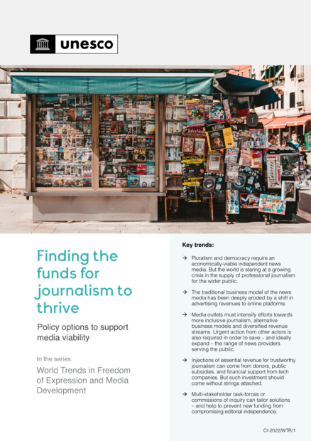 "The traditional business model of the news media has been deeply eroded by a shift in advertising revenues to online platforms. Media outlets must intensify efforts towards more inclusive journalism, alternative business models and diversified revenue streams. Urgent action from other actors is also required in order to save – and ideally expand – the range of news providers serving the public. Injections of essential revenue for trustworthy journalism can come from donors, public subsidies, and financial support from tech companies. But such investment should come without strings attached. Multi-stakeholder task-forces or commissions of inquiry can tailor solutions – and help to prevent new funding from compromising editorial independence." (Key trends, page 1)