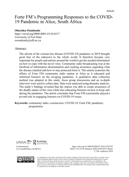 "The advent of the coronavirus disease (COVID-19) pandemic in 2019 brought great fear of the unknown to the whole world. It therefore became very important for people and nations around the world to get the needed information on how to cope with the novel virus. Community radio broadcasting was at the forefront of information dissemination and creating awareness regarding what the disease entailed and how to stay protected from it. This article examines the efforts of Forte FM community radio station in Alice as it educated and informed listeners on the ravaging pandemic. A qualitative data collection method was adopted in this study; focus group discussions and an in-depth interview were used to collect data. Data were analysed using thematic analysis. The study’s findings revealed that the station was able to create awareness of the deadly nature of the virus while also educating listeners on how to keep safe during the pandemic. The article concludes that Forte FM consistently played a pivotal role in engaging listeners on COVID-19 issues." (Abstract)