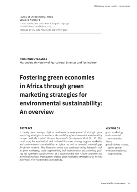 "A trendy issue amongst African businesses is employment of strategic green marketing strategies to maximize the visibility of environmental sustainability, in sync with the United Nations Sustainable Development Goal No. 15. This short essay has synthesized and reviewed literature relating to green marketing and environmental sustainability in Africa, as well as revealed potential gaps for future research. This literature review was conducted using keywords such as green marketing, social responsibility and environmental sustainability guiding the systematic search process. It is recommended that African countries and associated business organizations employ green marketing strategies so as to raise awareness of environmental sustainability." (Abstract)