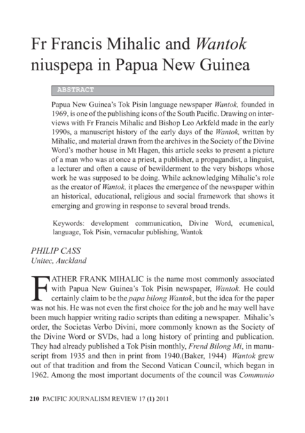 "Papua New Guinea’s Tok Pisin language newspaper Wantok, founded in 1969, is one of the publishing icons of the South Pacific. Drawing on interviews with Fr Francis Mihalic and Bishop Leo Arkfeld made in the early 1990s, a manuscript history of the early days of the Wantok, written by Mihalic, and material drawn from the archives in the Society of the Divine Word’s mother house in Mt Hagen, this article seeks to present a picture of a man who was at once a priest, a publisher, a propagandist, a linguist, a lecturer and often a cause of bewilderment to the very bishops whose work he was supposed to be doing. While acknowledging Mihalic’s role as the creator of Wantok, it places the emergence of the newspaper within an historical, educational, religious and social framework that shows it emerging and growing in response to several broad trends." (Abstract)