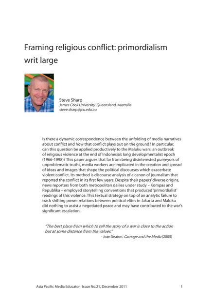 "Is there a dynamic correspondence between the unfolding of media narratives about conflict and how that conflict plays out on the ground? In particular, can this question be applied productively to the Maluku wars, an outbreak of religious violence at the end of Indonesia’s long developmentalist epoch (1966-1998)? This paper argues that far from being disinterested purveyors of unproblematic truths, media workers are implicated in the creation and spread of ideas and images that shape the political discourses which exacerbate violent conflict. Its method is discourse analysis of a canon of journalism that reported the conflict in its first few years. Despite their papers’ diverse origins, news reporters from both metropolitan dailies under study – Kompas and Republika – employed storytelling conventions that produced ‘primordialist’ readings of this violence. This textual strategy on top of an analytic failure to track shifting power relations between political elites in Jakarta and Maluku did nothing to assist a negotiated peace and may have contributed to the war’s significant escalation." (Abstract)