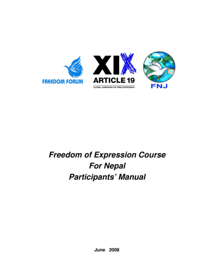 "This Manual is primarily designed to be used as a resource for a training course for laypersons on the basics of freedom of expression. It is intended to be used course participants, as well as by the trainers delivering it. While it is largely selfexplanatory, at the same time training will work better if delivered by trainers who have been provided with inputs from freedom of expression experts, so that they have a broader set of resources to draw upon than are set out in the Manual itself. As a result, it is idea if the trainers have undergone a training of trainers session on how to use the Manual." (Pages 1-2)