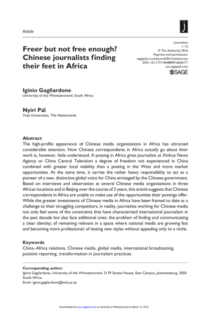 "The high-profile appearance of Chinese media organizations in Africa has attracted considerable attention. How Chinese correspondents in Africa actually go about their work is, however, little understood. A posting in Africa gives journalists at Xinhua News Agency or China Central Television a degree of freedom not experienced in China combined with greater local visibility than a posting in the West and more market opportunities. At the same time, it carries the rather heavy responsibility to act as a pioneer of a new, distinctive global voice for China envisaged by the Chinese government. Based on interviews and observation at several Chinese media organizations in three African locations and in Beijing over the course of 3 years, this article suggests that Chinese correspondents in Africa are unable to make use of the opportunities their postings offer. While the greater investments of Chinese media in Africa have been framed to date as a challenge to their struggling competitors, in reality, journalists working for Chinese media not only feel some of the constraints that have characterized international journalism in the past decade but also face additional ones: the problem of finding and communicating a clear identity; of remaining relevant in a space where national media are growing fast and becoming more professional; of testing new styles without appealing only to a niche." (Abstract)