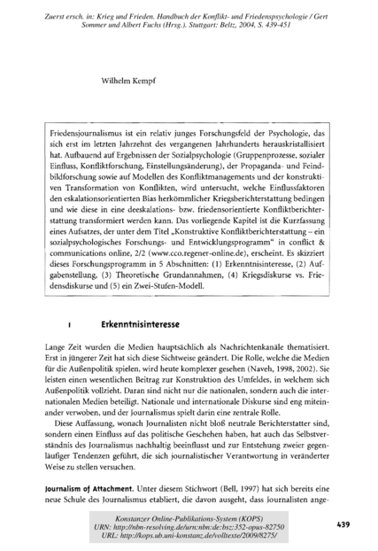 "Friedensjournalismus ist ein relativ junges Forschungsfeld der Psychologie, das sich erst im letzten Jahrzehnt des vergangenen Jahrhunderts herauskristallisiert hat. Aufbauend auf Ergebnissen der Sozialpsychologie (Gruppenprozesse, sozialer Einfluss, Konfliktforschung, Einstellungsänderung), der Propaganda- und Feindbildforschung sowie auf Modellen des Konfliktmanagements und der konstruktiven Transformation von Konflikten, wird untersucht, welche Einflussfaktoren den eskalationsorientierten Bias herkömmlicher Kriegsberichterstattung bedingen und wie diese in eine deeskalations- bzw. friedensorientierte Konfliktberichterstattung transformiert werden kann. Das vorliegende Kapitel ist die Kurzfassung eines Aufsatzes, der unter dem Titel "Konstruktive Konfliktberichterstattung - ein sozialpsychologisches Forschungs- und Entwicklungsprogramm" in conflict & communications onHne, 2/2 (www.cco.regener-online.de). erscheint. Es skizziert dieses Forschungsprogramm in 5 Abschnitten: (1) Erkenntnisinteresse, (2) Aufgabenstellung, (3) Theoretische Grundannahmen, (4) Kriegsdiskurse vs. Friedensdiskurse und (5) ein Zwei-Stufen-Modell." (Seite 439)