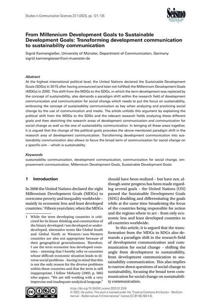 "At the highest international political level, the United Nations declared the Sustainable Development Goals (SDGs) in 2015 after having announced (and later not fulfilled) the Millennium Development Goals (MDGs) in 2000. This shift from the MDGs to the SDGs, in which the term development was replaced by the concept of sustainability, also demands a paradigm shift within the research field of development communication and communication for social change which needs to put the focus on sustainability, embracing the concept of sustainability communication as key when analyzing and practicing social change by the use of communication and media. The article unfolds this argument by explaining the political shift from the MDGs to the SDGs and the relevant research fields analyzing these different goals and then sketching the research areas of development communication and communication for social change as well as the one of sustainability communication. In bringing all these areas together, it is argued that the change of the political goals provokes the above mentioned paradigm shift in the research area of development communication. Transforming development communication into sustainability communication also allows to focus the broad term of communication for social change on a specific aim – which is sustainability." (Abstract)