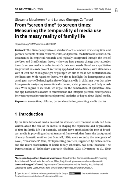 "The discrepancy between children’s actual amount of viewing time and parents’ accounts of their concerns, rules, and parental mediation choices has been documented in empirical research, and typically interpreted through the lens of the Uses and Gratifications theory – showing how parents change their attitudes towards screen media in order to satisfy their own needs. Based on a qualitative longitudinal research project, including app-based media diaries, with 20 families with at least one child aged eight or younger, we aim to make two contributions to the literature. With regard to theory, we aim to highlight the heterogeneous and contingent ways of balancing the place of digital media in children’s lives that arise from parents navigating screen time discourses, social pressures, and daily schedules. With regard to methods, we argue for the combination of qualitative data and app-based media diaries to contextualise and interpret potential discrepancies between reported screen time and parental anxieties or hopes about digital media." (Abstract)