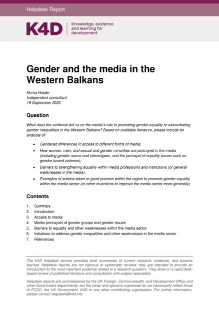 "This rapid literature review explores the role that media in the Western Balkans plays in issues of gender (in)equality. The countries discussed are Albania, Bosnia and Herzegovina (BiH), Croatia, Kosovo, North Macedonia, Montenegro, Serbia [...] While there is a body of literature that discusses access of men and women to media spaces (e.g. airtime and news headlines) and moreover media portrayals of gender groups within the region, there is very limited research on barriers to gender equality within the media sector itself and on media initiatives aimed at promoting gender equality. As such, the barriers section in this report also draws on discussion of gender equality in the region generally; and on issues with the media in the region generally. There are implicit linkages that can be made, however. For example, the persistence of gender inequality and traditional patriarchy throughout the region influences how the media operates and in turn is reflected in the media ..." (Summary, page 2)