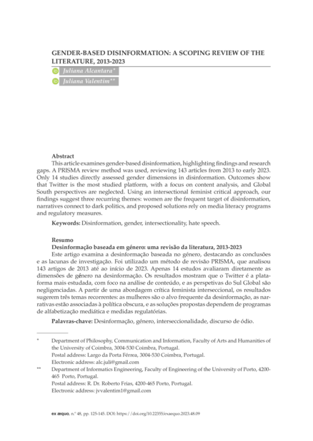 "This article examines gender-based disinformation, highlighting findings and research gaps. A PRISMA review method was used, reviewing 143 articles from 2013 to early 2023. Only 14 studies directly assessed gender dimensions in disinformation. Outcomes show that Twitter is the most studied platform, with a focus on content analysis, and Global South perspectives are neglected. Using an intersectional feminist critical approach, our findings suggest three recurring themes: women are the frequent target of disinformation, narratives connect to dark politics, and proposed solutions rely on media literacy programs and regulatory measures." (Abstract)