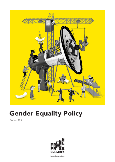 "Free Press Unlimited believes that gender equality is central to achieving its overall long-term objective that media and journalists constitute a diverse and professional media landscape and function as change agents. As such, they contribute to the overall vision of a just, inclusive and peaceful society. Inclusive refers to men and women of all ages and backgrounds. Free Press Unlimited’s focus on equal access, opportunities and rights for men and women media practitioners is based on existing and persisting gaps and stereotypes in media and society that often benefit men over women. To contribute to bridging these gaps, Free Press Unlimited adopted the thematic area Gender & Media. Its vision of success is: ‘Media actively advocate for gender equality and work towards increased participation and decision making of women in and through the media.’ The Gender Equality Policy reinforces this commitment and outlines the organisation’s objectives and standards in relation to gender and the media. The objective of this policy is to promote gender equality in the programmes, in partnerships and cooperation with others, in the organisation itself and in external communication." (Page 3)