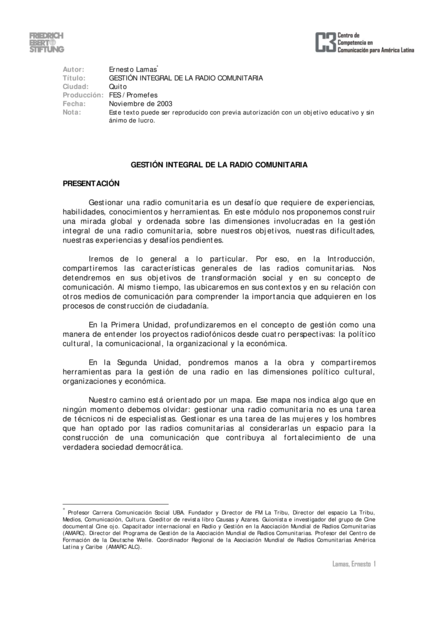 Quito: Centro de Competencia en Comunicación para América Latina Friedrich-Ebert-Stiftung (FES) (2003), 80 pp.