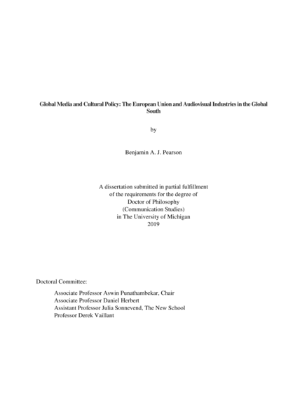 "This dissertation explores audiovisual assistance programs through an examination of the largest such program: the EU’s ACPCultures+, which since 2008 has awarded over 50 million Euros to nearly 60 audiovisual training programs, distribution initiatives, and production projects in sub-Saharan Africa and the Caribbean. Using textual and policy analyses, in-depth interviews, and both digital ethnography and multi-sited ethnographic research in Brussels, Addis Ababa, and Nairobi, I analyze three case studies of projects funded by ACPCultures+ – a screenwriting course in Kenya, a pan-African video-on-demand platform, and the first Ethiopian film to screen at Cannes film festival – while tracing the circulation of the program’s aims and policies from its headquarters in Brussels to audiovisual professionals in Africa and the Caribbean. These cases show how, as ACPCultures+ grapples with media diversity in an era of globalization, it builds on postwar histories of both international development and EU cultural and audiovisual policies in ways that simultaneously enable and constrain media industries in the Global South. Ultimately, this research demonstrates how audiovisual assistance programs are an underexamined piece of the global media landscape in which Northern policies and Southern practices together can reframe debates about media and cultural hegemony and suggest new ways of conceptualizing the geographies of audiovisual industries and policy." (Abstract)