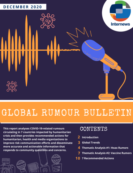 "For the last 6 months, the Internews' Rooted in Trust project has collected more than 5,238 rumours from seven countries: Afghanistan, Lebanon, Philippines, Colombia, Central African Republic, Mali and Sudan. We work in 12 local languages and collect data across seven major social media platforms and a wide range of feedback collection channels, including door-to-door surveys, informal meetings, assessments, community meetings, listening groups, SMS, and radio, with 27 partners across the seven countries. This Global Rumour Bulletin brings together our reflections on two key themes that represent more than 20% of all rumours collected across the seven project sites: rumours that the pandemic either doesn’t exist at all, or that it is a conspiracy, and rumours about vaccines and vaccinations. On the final page you will find a set of recommendations on how we feel the response to rumours and misinformation on these two key themes can be improved." (Introduction)