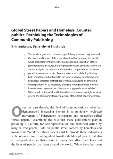 "This article argues that community publishing initiatives might extend the scope and impact of their work by critically examining the ways in which technology influences the production and circulation of their [counter]public discourse. Building upon the work of Paula Mathieu, the author analyzes the material and discursive complexities of the “street paper” movement as a site of community-based publishing, finding both limitations and potential in the survival-driven, print-based, and hyperlocal character of street paper media. Discussing an emerging digital platform for participatory blogging among homeless and low-income street paper vendors, the author suggests how a model of Web-based, multimodal, and interactive communication might work to extend the community literacy practices of the street paper movement." (Abstract)