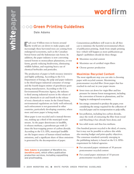 "The production of paper is both resource intensive and highly polluting. According to the U.S. Department of Energy, the pulp and paper industry is the third-largest industrial consumer of energy and the fourth-largest emitter of greenhouse gases among manufacturers. According to the U.S. Environmental Protection Agency, the industry is third among industrial sectors in the release of toxic chemicals to air and fourth in the release of toxic chemicals to water. In the United States, environmental regulations are fairly well enforced; such enforcement is not guaranteed in other countries, particularly developing countries, where more and more paper is being made. Most paper is not recycled and is instead thrown out, making up a third of the municipal waste stream. As the paper deteriorates in landfills, it releases methane, a greenhouse gas with 23 times the heat-trapping power of carbon dioxide. According to the U.S. EPA, municipal landfills are the largest source of human-related methane emissions, and a significant share of these emissions is generated by the decomposition of paper. Conscientious publishers will want to do all they can to minimize the harmful environmental effects of publication printing. Aside from simply printing less - which will happen as more publications go digital - publishers should do three things: Maximize recycled content; Maximize use of certified virgin fibers; Choose greener production." (Page 1)