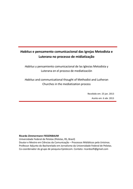"Ao analisar, neste artigo, alguns dos documentos oficiais sobre comunicação produzidos no âmbito das igrejas brasileiras Metodista e Evangélica de Confissão Luterana, busca se observar como o habitus midiático comparece no pensamento comunicacional dessas igrejas, operando sobre os modos como intentam difundir valores, obter visibilidade e estabelecer vínculos. Observa se que as igrejas reconhecem no midiático um lugar estratégico para realização de seus objetivos, mas procuram subordiná lo ao habitus reli gioso. Nesse processo de acomodações, negociações e resistências, que se dá em operações auto e heterorreferentes e que envolve instituições não midiáticas, midiáticas e atores individuais, as igrejas acabam implicadas na midiatização mais ampla de toda a sociedade." (Resumo)
