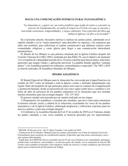 "En el pressnte artículo buscamos motivar un camino juntos, adentrando en el espíritu sinodal y en la 'canoa amazónica' para descubrir las riquezas y las amenazas que sufre este territorio, para reflexionar el camino comunicativo que debemos realizar como comunidades religiosas y como Iglesia para llegar a una comunicación intercultural panamazónica" (Página 45)