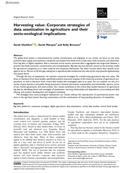 "The global food system is characterized by market concentration and oligopoly. In our article, we focus on the most powerful input supply and machinery companies and analyze how these firms create value, both economic and otherwise, from big data. In digital capitalism, data is valorized across sectors; personal data is aggregated into large-scale datasets, a practice that feeds economic concentration and monopolization. Big data also has become central to the business model for agricultural companies; it is a claim made by the companies themselves. Yet, little is known about their specific strategies to do so. We aim to fill this gap, asking how is agricultural data transformed into value by the most powerful agribusinesses and ag-tech firms? Through the lens of assetization, we examine corporate strategies for transforming agricultural data into value. We draw on literature from food studies, specifically political economic analyses of the historical practices of agricultural corporations, as well as literature from critical data studies that investigates data as an asset. For our analysis, we rely on a variety of gray literature and public-facing documents: financial documents, sustainability and shareholder reports, terms of use, license agreements, and news articles. Our results contribute to the critical data studies literature on agricultural big data by identifying three main strategies of assetization: securing relationships and dependence, price-setting and data sharing, and product development and targeted marketing. The strategies have socio-ecological implications; our results indicate the reproduction of asymmetrical power relations in the agri-food system favoring corporations and the continuation of long-standing dynamics of inequalities." (Abstract)