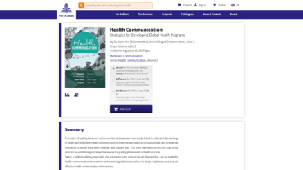 "Promotion of healthy behaviors and prevention of disease are inextricably linked to cultural understandings of health and well-being. Health communication scholarship and practice can substantially and strategically contribute to people living safer, healthier, and happier lives. This book represents a concrete step in that direction by establishing a strategic framework for guiding global and local health practices. Taking a multi-disciplinary approach, the volume includes state-of-the-art theories that can be applied to health communication interventions and practical guidelines about how to design, implement, and evaluate effective health communication interventions. Few books have synthesized such a broad range of theories and strategies of health communication that are applicable globally, and also provided clear advice about how to apply such strategies. This volume combines academic research and field experience, guided by past and future research agendas and on-the-ground implementation opportunities." (Publisher description)