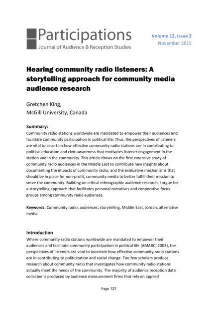 "This article draws on the first extensive study of community radio audiences in the Middle East to contribute new insights about documenting the impacts of community radio, and the evaluative mechanisms that should be in place for non-profit, community media to better fulfill their mission to serve the community. Building on critical ethnographic audience research, I argue for a storytelling approach that facilitates personal narratives and cooperative focus groups among community radio audiences." (Summary)