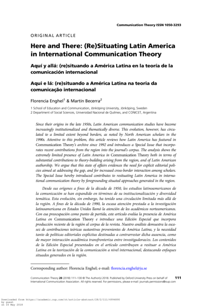 "Since their origins in the late 1950s, Latin American communication studies have become increasingly institutionalized and thematically diverse. This evolution, however, has circulated to a limited extent beyond borders, as noted by North American scholars in the 1990s. Attentive to this problem, this article reviews how Latin America has featured in Communication Theory’s archive since 1992 and introduces a Special Issue that incorporates recent contributions from the region into the journal’s corpus. The analysis shows the extremely limited presence of Latin America in Communication Theory both in terms of substantial contributions to theory-building arising from the region, and of Latin American authorship. We argue that this state of affairs evidences the need for explicit editorial policies aimed at addressing the gap, and for increased cross-border interaction among scholars. The Special Issue hereby introduced contributes to resituating Latin America in international communication theory by foregrounding situated approaches generated in the region." (Abstract)