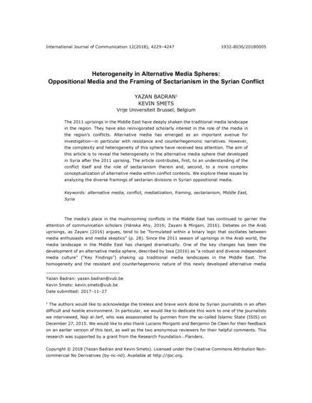 "The 2011 uprisings in the Middle East have deeply shaken the traditional media landscape in the region. They have also reinvigorated scholarly interest in the role of the media in the region’s conflicts. Alternative media has emerged as an important avenue for investigation—in particular with resistance and counterhegemonic narratives. However, the complexity and heterogeneity of this sphere have received less attention. The aim of this article is to reveal the heterogeneity in the alternative media sphere that developed in Syria after the 2011 uprising. The article contributes, first, to an understanding of the conflict itself and the role of sectarianism therein and, second, to a more complex conceptualization of alternative media within conflict contexts. We explore these issues by analyzing the diverse framings of sectarian divisions in Syrian oppositional media." (Abstract)