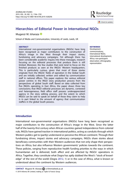 "International non-governmental organisations (INGOs) have long been recognised as major contributors to the construction of Africa's image in the West through their impact stories, fundraising and advocacy campaigns. Yet although there has been considerable academic inquiry into these messages, research focusing on the editorial processes that produce them is still limited. Moreover, the few studies that exist tend to focus on the finished products as seen at the INGOs' Western headquarters. This is particularly curious, given that most of these stories originate from the INGOs' fields of operation in the Global South and are initially collected, written and edited by communication staff in national offices. This paper explores the various editorial power centres in the INGO story production process from the perspectives of global South staff. Based on data collected from five INGOs operating in East Africa, the paper draws three key conclusions: that INGO editorial processes are dynamic, contested and heterogeneous, field office staff possess underappreciated agency in the story editing process, and the extent to which INGOs can be said to speak on behalf of those they claim to help is in part linked to the amount of agency that communication staffers in the global South possess." (Abstract)