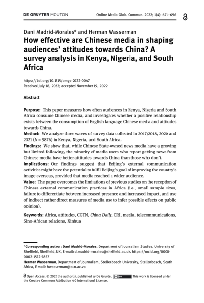 "This paper measures how often audiences in Kenya, Nigeria and South Africa consume Chinese media, and investigates whether a positive relationship exists between the consumption of English language Chinese media and attitudes towards China. Method: We analyze three waves of survey data collected in 2017/2018, 2020 and 2021 (N = 5876) in Kenya, Nigeria, and South Africa. Findings: We show that, while Chinese State-owned news media have a growing but limited following, the minority of media users who report getting news from Chinese media have better attitudes towards China than those who don’t. Implications: Our findings suggest that Beijing’s external communication activities might have the potential to fulfil Beijing’s goal of improving the country’s image overseas, provided that media reached a wider audience." (Abstract)