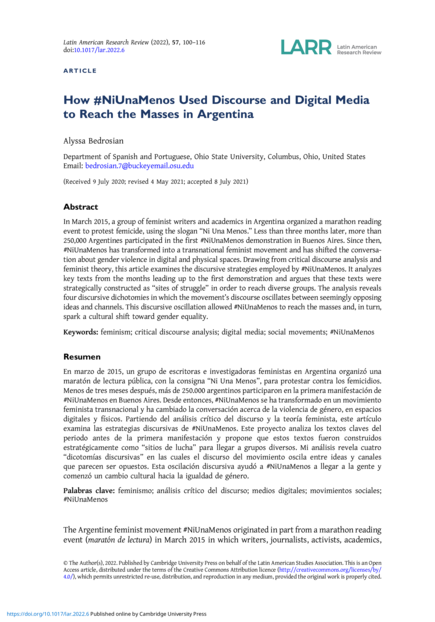 "In March 2015, a group of feminist writers and academics in Argentina organized a marathon reading event to protest femicide, using the slogan “Ni Una Menos.” Less than three months later, more than 250,000 Argentines participated in the first #NiUnaMenos demonstration in Buenos Aires. Since then, #NiUnaMenos has transformed into a transnational feminist movement and has shifted the conversation about gender violence in digital and physical spaces. Drawing from critical discourse analysis and feminist theory, this article examines the discursive strategies employed by #NiUnaMenos. It analyzes key texts from the months leading up to the first demonstration and argues that these texts were strategically constructed as “sites of struggle” in order to reach diverse groups. The analysis reveals four discursive dichotomies in which the movement’s discourse oscillates between seemingly opposing ideas and channels. This discursive oscillation allowed #NiUnaMenos to reach the masses and, in turn, spark a cultural shift toward gender equality." (Abstract)