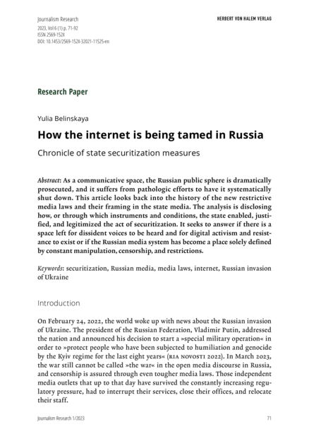 "As a communicative space, the Russian public sphere is dramatically prosecuted, and it suffers from pathologic efforts to have it systematically shut down. This article looks back into the history of the new restrictive media laws and their framing in the state media. The analysis is disclosing how, or through which instruments and conditions, the state enabled, justified, and legitimized the act of securitization. It seeks to answer if there is a space left for dissident voices to be heard and for digital activism and resistance to exist or if the Russian media system has become a place solely defined by constant manipulation, censorship, and restrictions." (Abstract)
