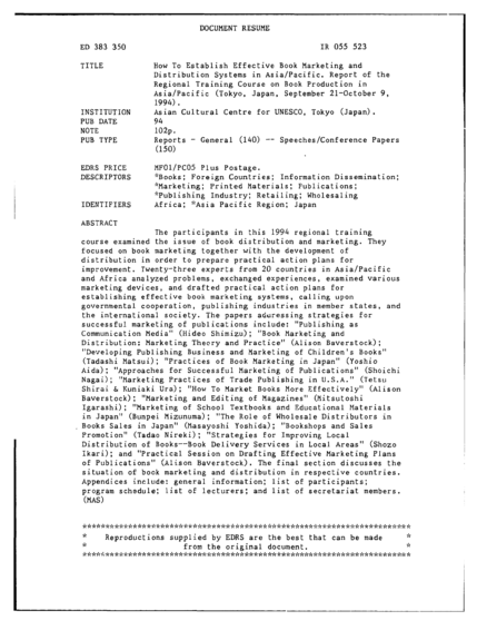 How to Establish Effective Book Marketing and Distribution Systems in Asia/Pacific: Report of the Regional Training Course on Book Production in Asia/Pacific (Tokyo, Japan, September 21-October 9, 1994)